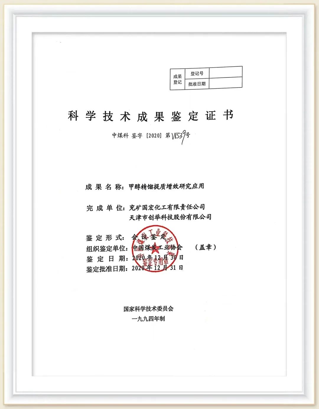 2020年,由兗礦國(guó)宏公司及創(chuàng)舉科技共同申報(bào)的“甲醇精餾提質(zhì)增效研究應(yīng)用”順利通過(guò)中國(guó)煤炭工業(yè)協(xié)會(huì)科學(xué)技術(shù)成果鑒定,并鑒定該項(xiàng)技術(shù)成果達(dá)到“國(guó)際先進(jìn)”水平。